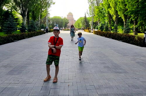 Прокатила пацанов по территории.